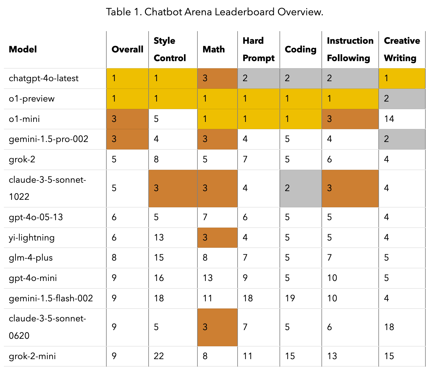 We note that this category is in a sense, orthogonal, to our previously introduced categories, such as Math and Coding. As such, we find interesting differences in rankings when looking at creative writing. Studying categories like creativity is important— the ranking signal on this type of prompts are innately dependent on human preference, and are difficult to obtain from traditional close-ended benchmarks without human-in-the-loop.