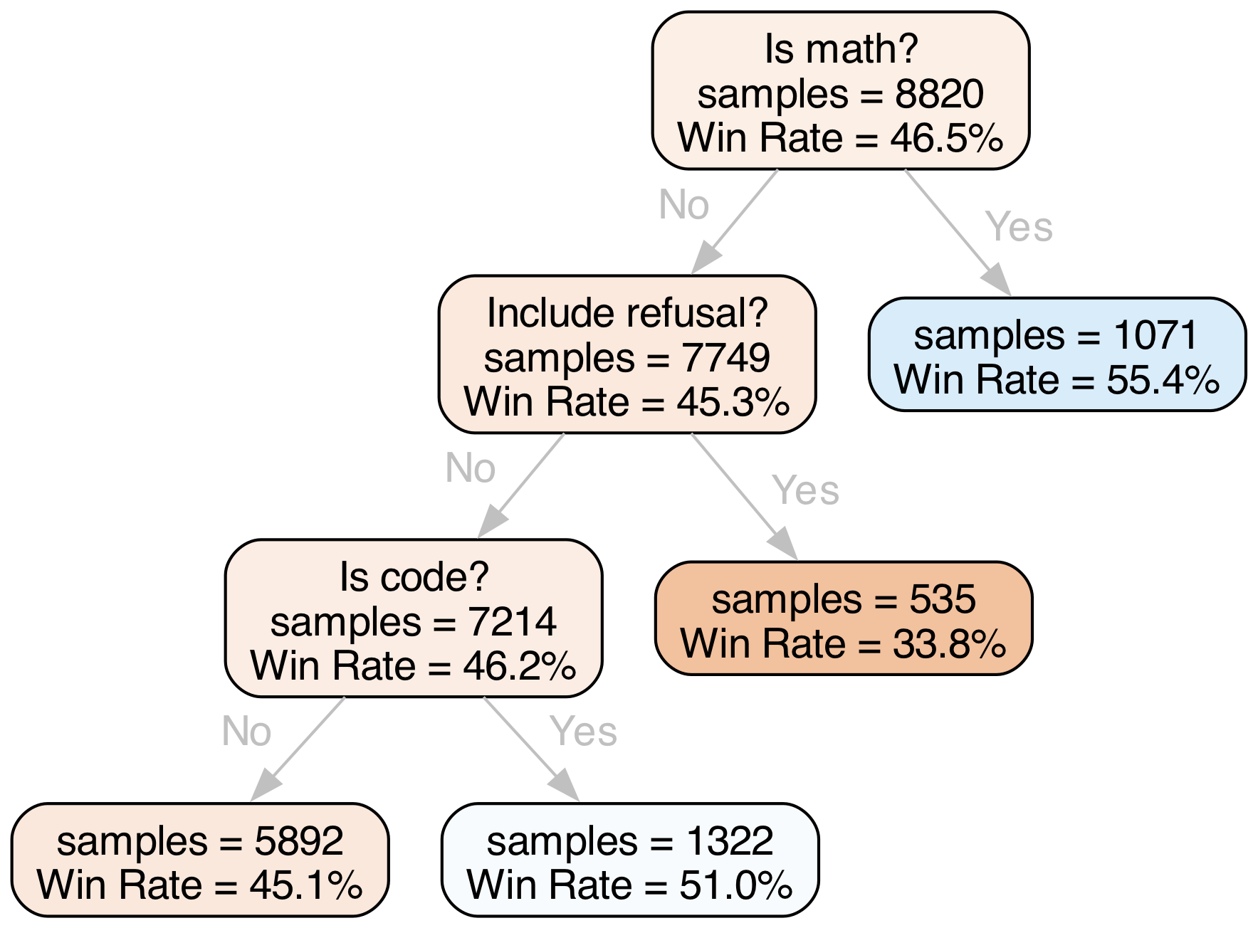 - Exclude Refusal: Excludes all battles where one or more LLM refused to respond. We currently identify refusals via simple keyword matching (eg. “I can’t assist”).