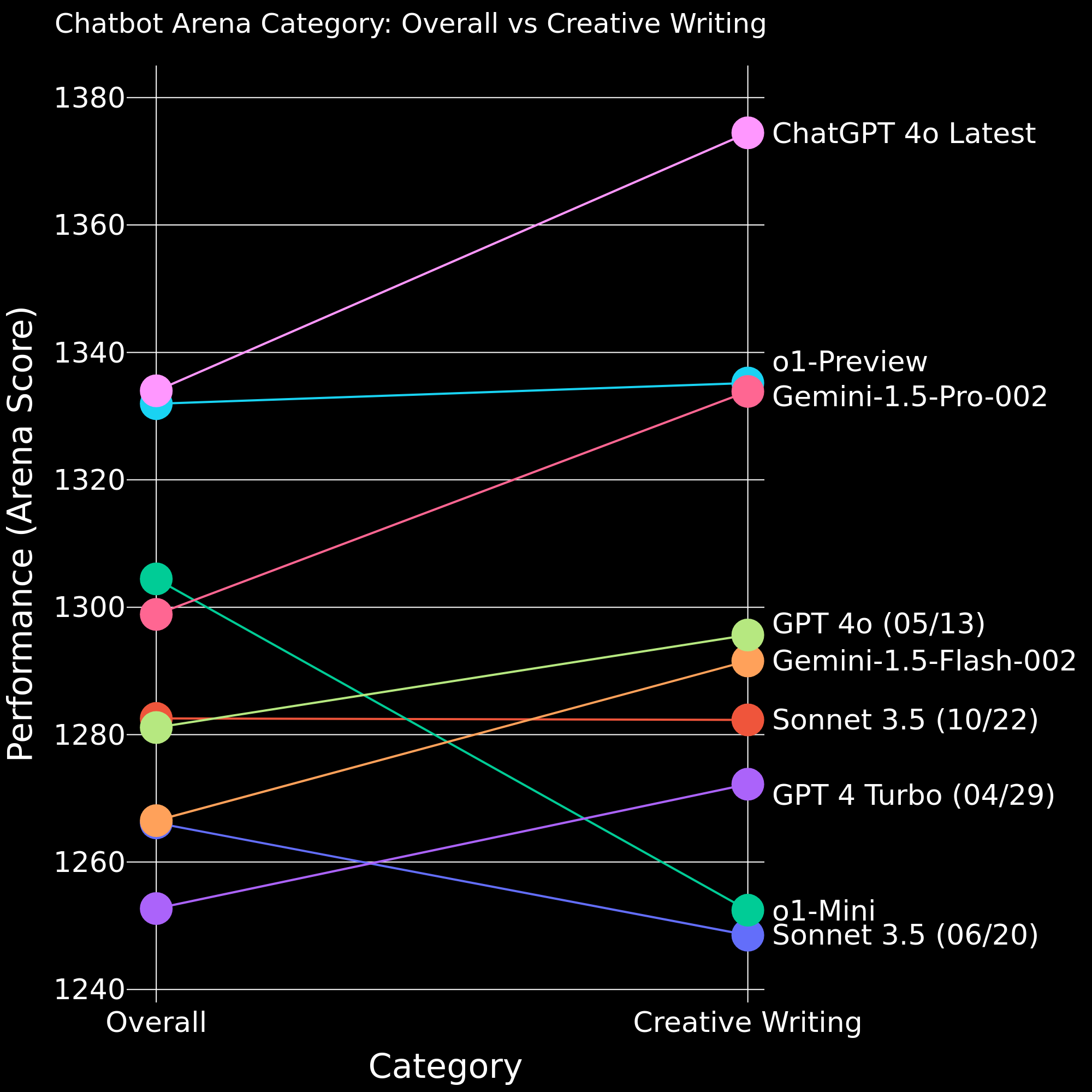 While the overall Chatbot Arena leaderboard provides a simple score for each model, people use LLMs for diverse purposes. This raises the question: which model is best for a specific use-case? To offer deeper insights into this question, we have been adding various categories to our leaderboard. Over time, we’ve introduced a wide array of categories, including hard prompts, instruction-following, math prompts, coding prompts, refusal handling, longer queries, multi-turn conversations, various languages, and style control. Today, we’re excited to announce the release of a new category: creative writing!