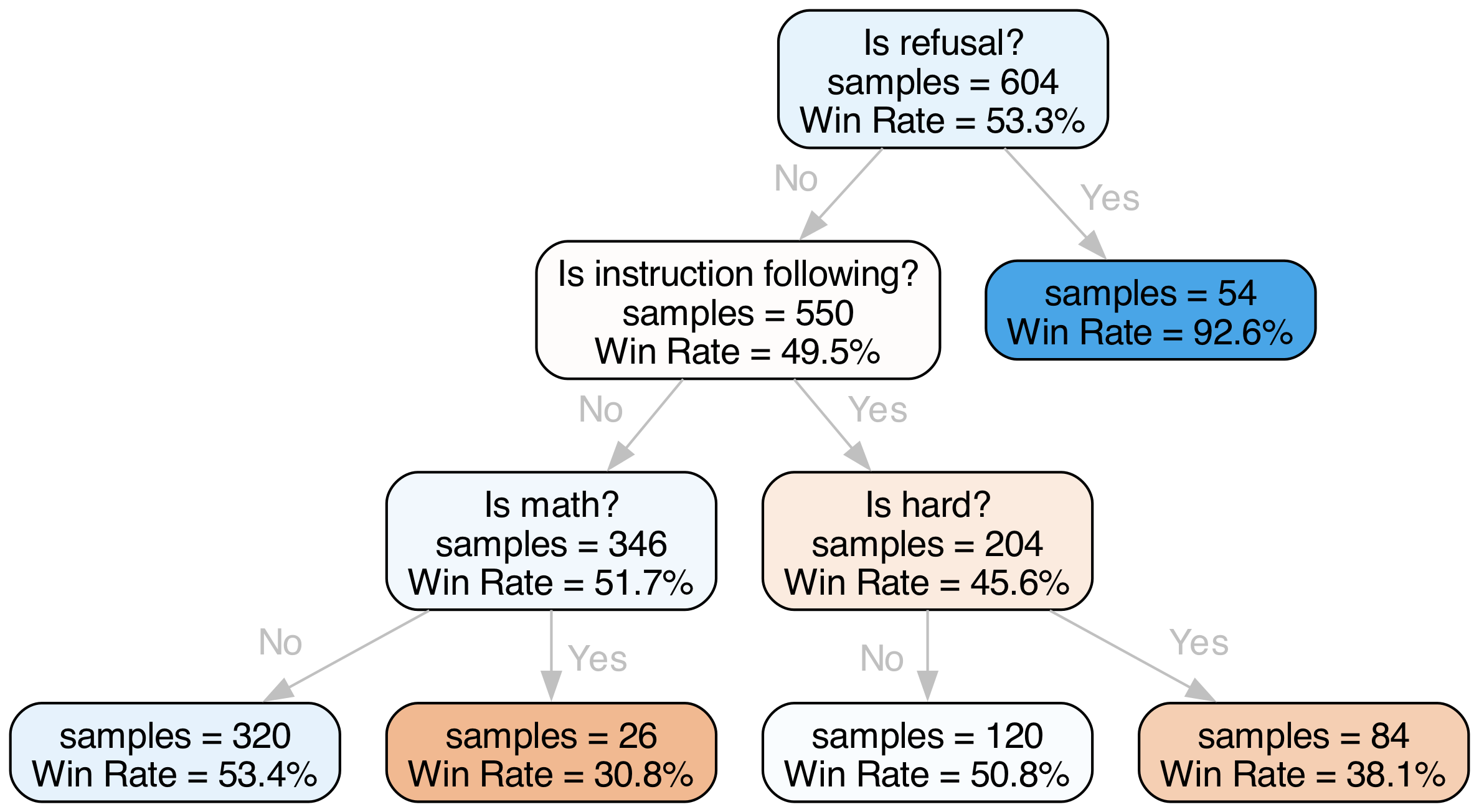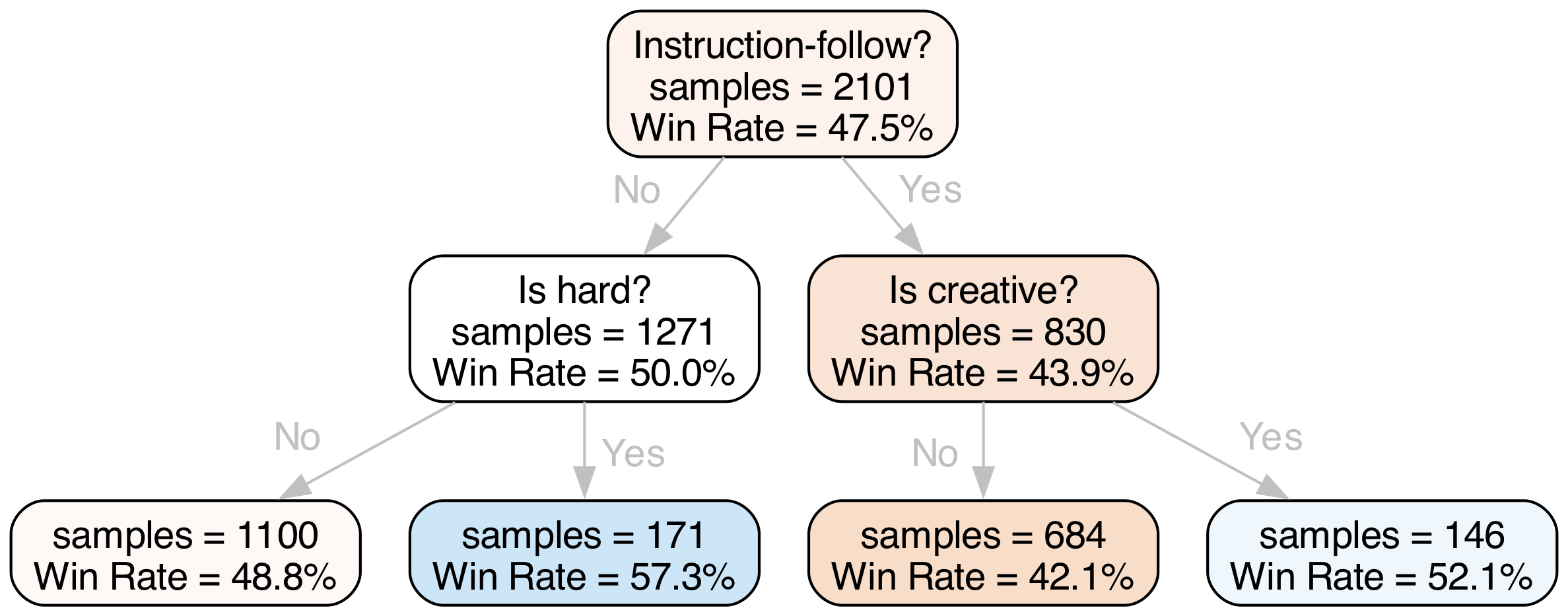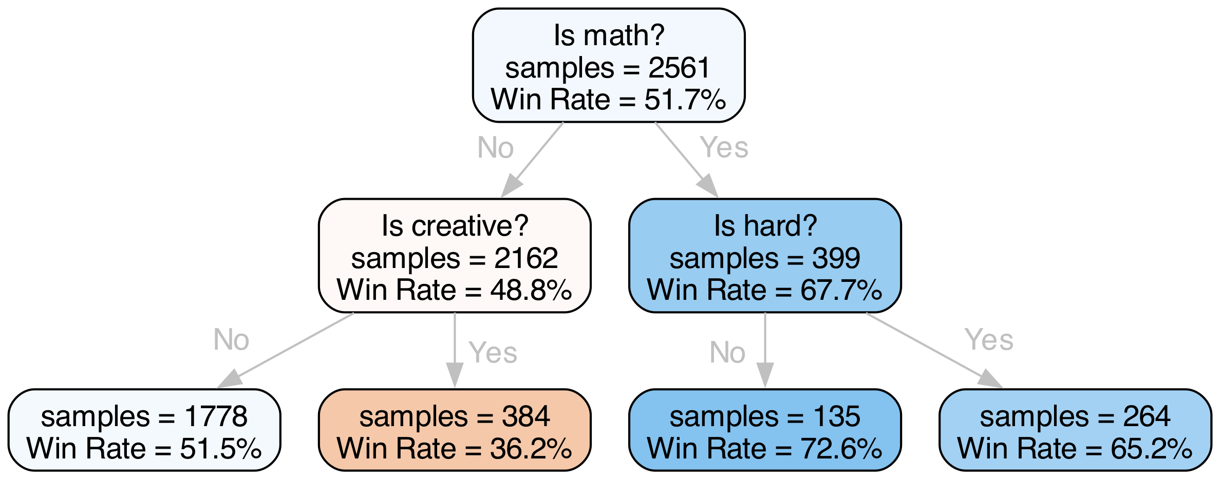 In Figure 5, we observed o1 Mini’s win-rate conditioned on specific categories, providing a visual map of its strengths and weaknesses. In math and hard prompts, o1 Mini performs significantly better, indicated by the blue half of the decision tree. On the other hand, o1 Mini struggles on creative writing when compared to other models.