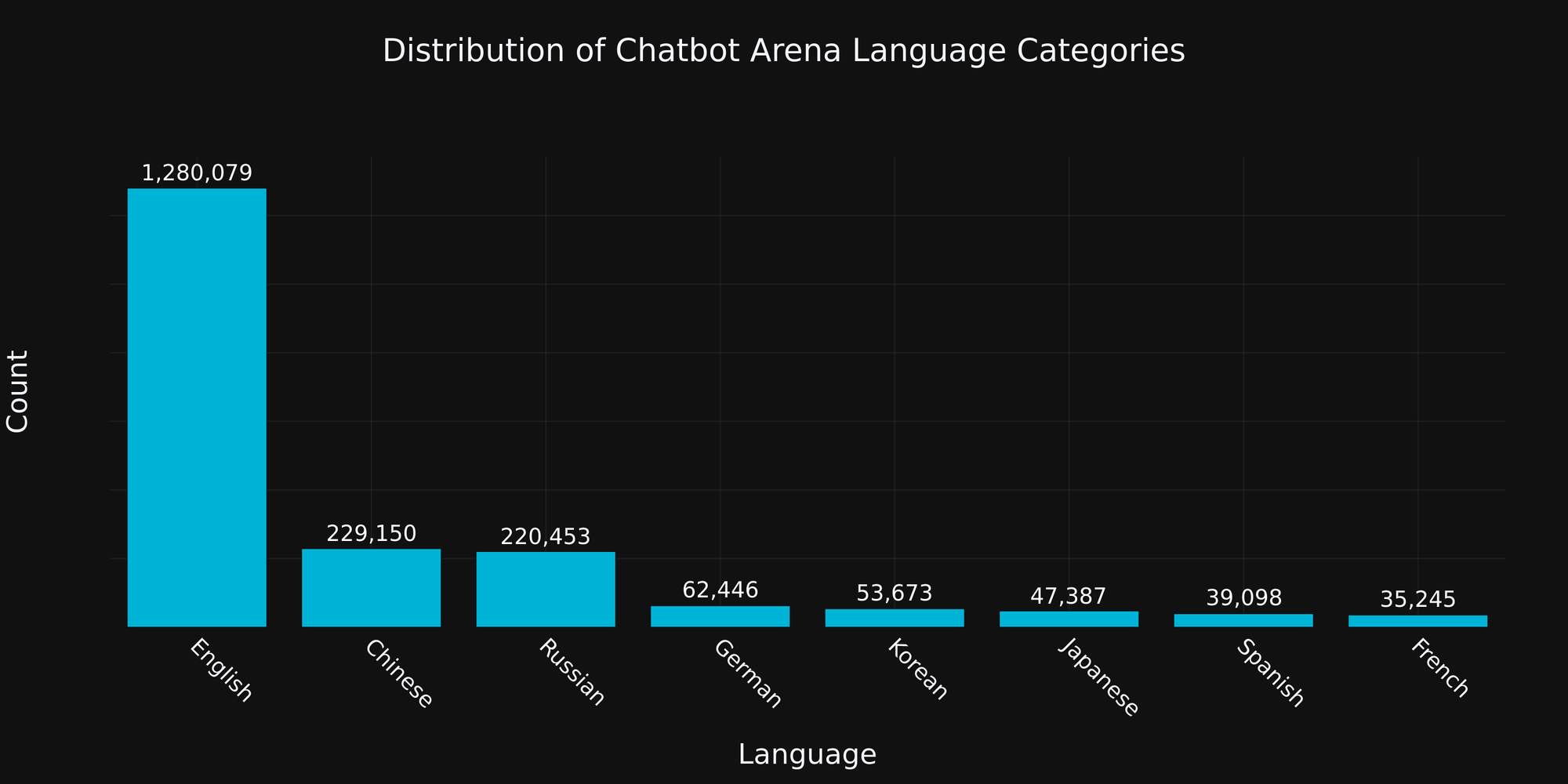 Each language category assesses a model’s proficiency in responding to prompts within the language. Many Chatbot Arena users engage with LLMs in languages beyond English, testing models on their versatility, linguistic precision, and cultural context in many languages.