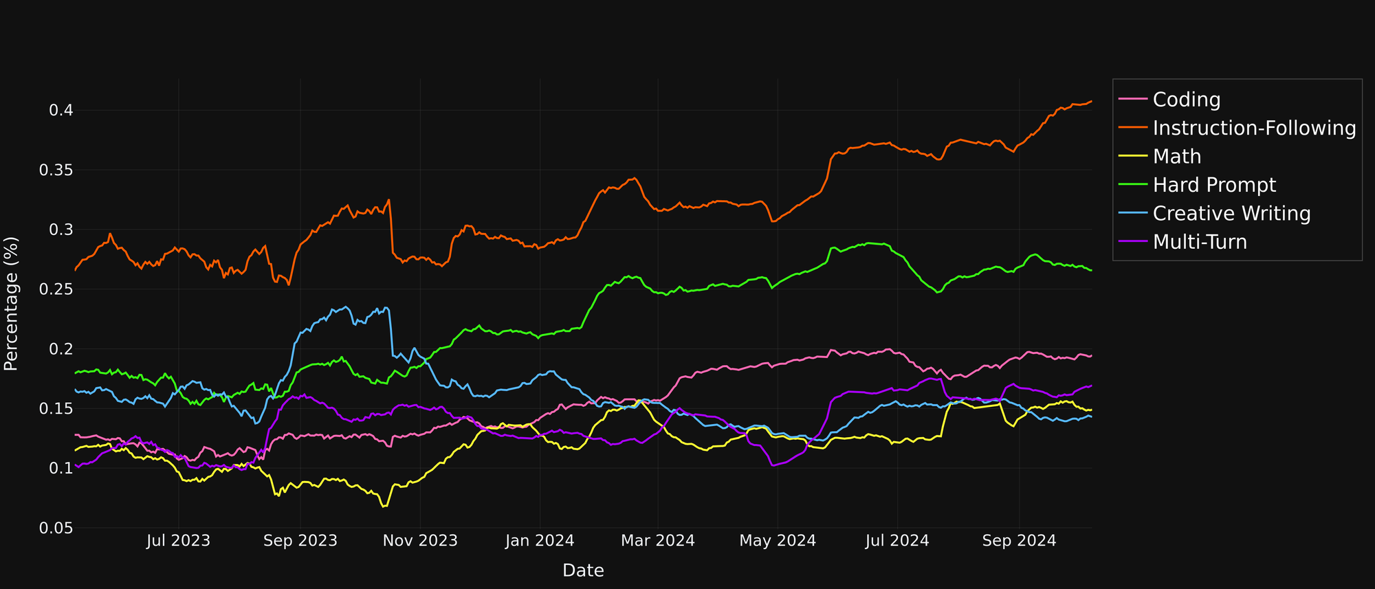 Are people asking harder questions as LLMs become better? We found the answer is yes! The percentage of Hard Prompts, Instruction-Following, Coding, and Math prompts has been increasing since Chatbot Arena’s launch back in April 2023.