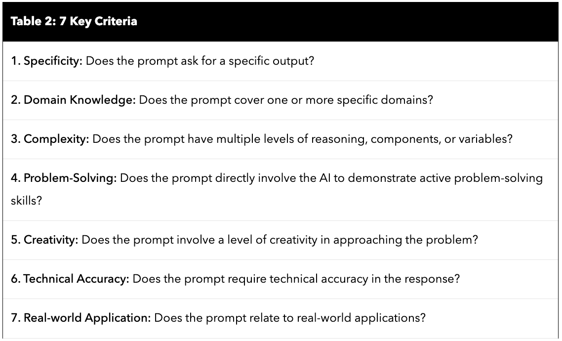 - Prompt quality: Each prompt should possess high quality to benchmark LLMs. we define several key criteria below (see Table 2)