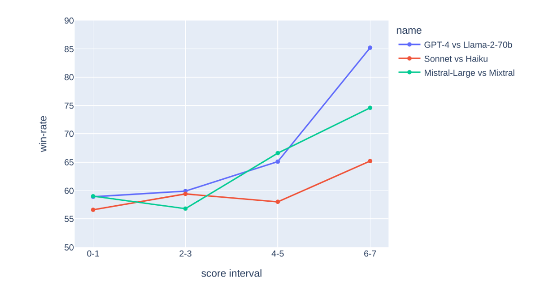 To see whether the prompt score correlates with separability, we sample 50 prompts per score and compare the responses from GPT-4 and Llama-70b, with GPT-4-Turbo as judge. We observe a strong correlation between high potential score and the win-rate of GPT-4 over Llama-70b. A similar trend is also observed in other model pairs such as Claude Sonnet vs Haiku and Mistral-large vs Mixtral.
