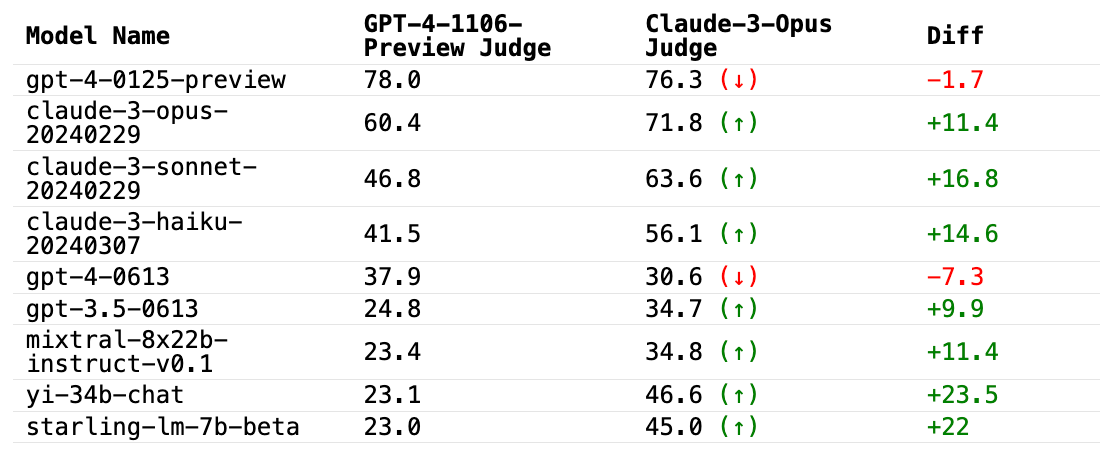 We find that Claude-3-Opus is much less likely to give harsh scores – it is particularly hesitant to proclaim one response as “significantly better” than another. In contrast, GPT-4-Turbo will identify errors in a model’s response that led to an incorrect answer and penalize the model with a significantly lower score. On the other hand, Claude-3-Opus sometimes overlooks smaller errors. Even when Claude-3-Opus does identify these errors, it tends to treat them as minor issues and shows leniency during scoring. This effect is particularly present in coding and math problems, where small mistakes are more likely to completely derail the final answer; these scorings are still given leniency from Claude-3-Opus but not GPT-4-Turbo. See the appendix below for specific examples of differing judgments, many of which exhibit this phenomenon.