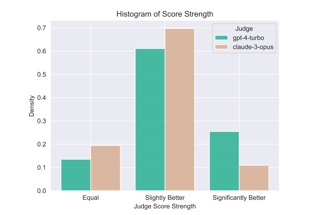 Despite the observed differences between Claude-3-Opus and GPT-4-Turbo judgment styles, we find the judges have an overall soft agreement rate of 80%. Two judgments “soft agree” if they are at most distance one apart, or in other words they do not contradict.