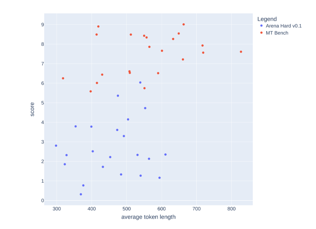LLM as judges are known to suffer from verbosity bias (Length-Controlled AlpacaEval). Below we plot the avg token length and score per model for both MT-Bench and Arena-Hard-Auto-v0.1. Visually, there isn’t a strong correlation between score and length.