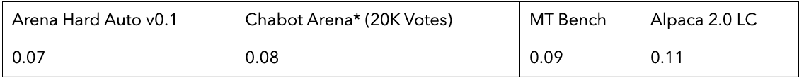 A well-defined fair-in-expectation loss for forecasting is Brier Score. Brier score rewards confidence when forecasts are correct while punishing confident errors. We can calculate the loss over a benchmark prediction of 1(πa<πb)(πa<πb) for each model pair with respect to the Chatbot Area ground truth scores to quantify a benchmark’s forecasting performance. Here we assume Chatbot Arena as “ground truth” as both Alpaca 2.0 LC and Arena Hard Auto are advertised as an inexpensive alternative to Chatbot Arena as an evaluation pipeline. We will conduct future study on correlation comparison where we instead use Chatbot Arena’s Bradley Terry coefficient derived from similar distributions as the given benchmark.