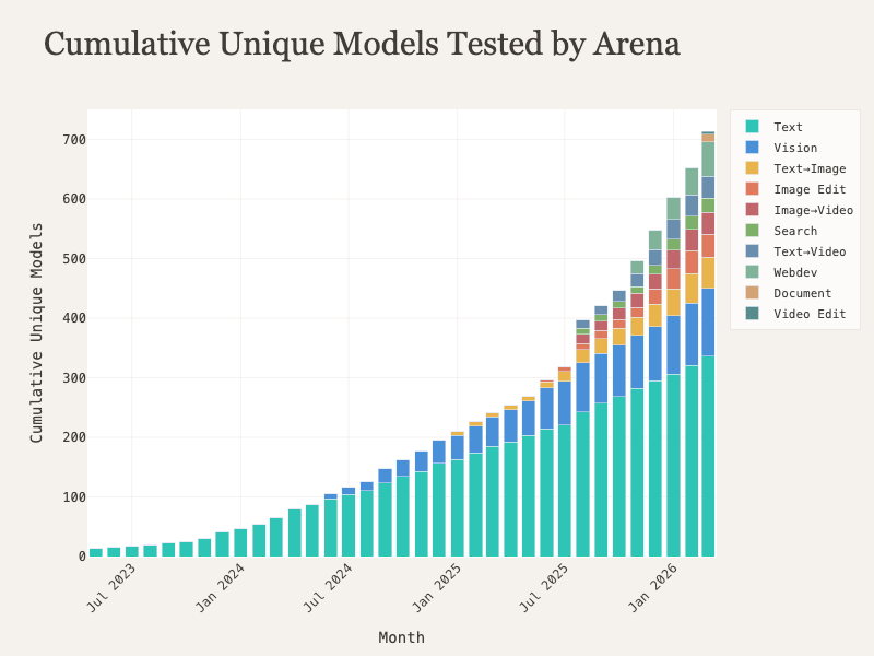 It’s also interesting to look at the total number of models we’ve tested on the platform over time. Visualizing this information really highlights the explosion of AI capabilities across different modalities and how we have scaled our evaluations to cover the field as it expands.