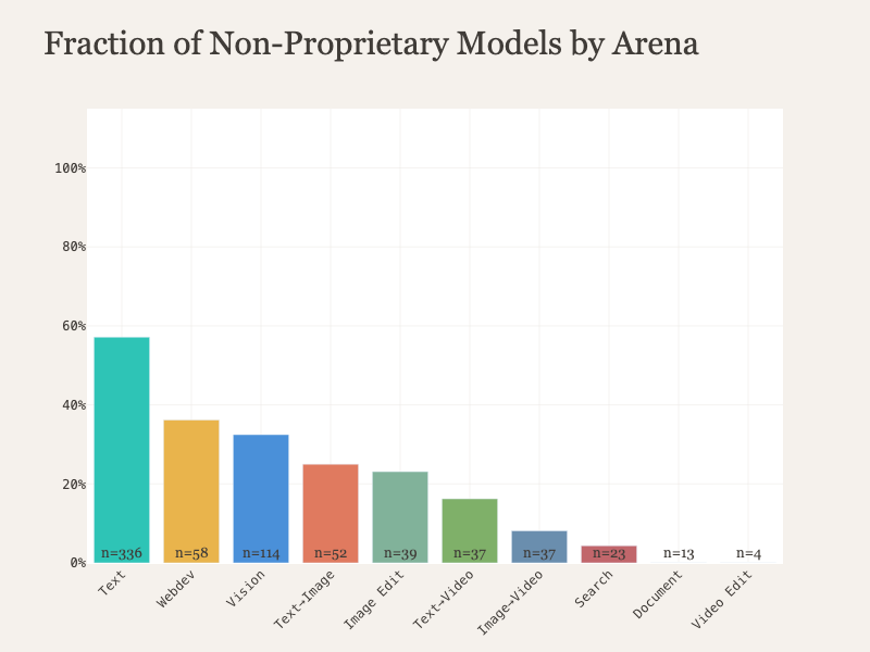 This dataset also makes comparisons between arenas very straightforward. By looking at the latest split and the license column, we can get the count and rate of open source vs. proprietary models on each leaderboard. We can see that on the Text Arena leaderboard, more than half of the models are under some form of open or non-proprietary license, but that fraction is lower for other modalities and domains where the open-source fine tuning infra isn’t as mature.