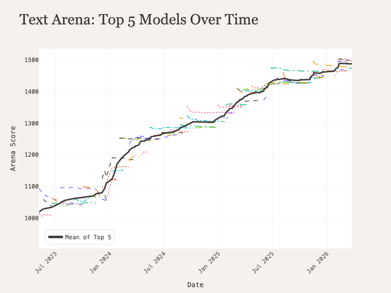 Having the full leaderboard history accessible in a single dataset unlocks some avenues of analysis beyond a static list. For example, we can look at the scores of the top five models on the Text Arena leaderboard since May 2023 and see the march of progress visually, as the mean score of the leading models has risen from a little over 1,000 to nearly 1,500.
