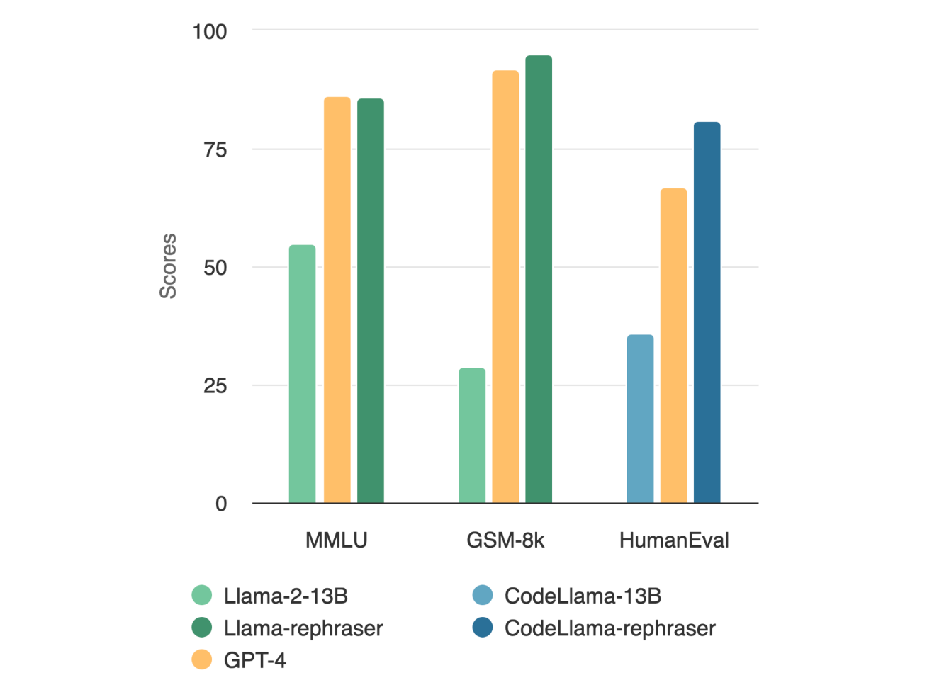 Announcing Llama-rephraser: 13B models reaching GPT-4 performance in major benchmarks (MMLU/GSK-8K/HumanEval)! To ensure result validity, we followed OpenAI’s decontamination method and found no evidence of data contamination.