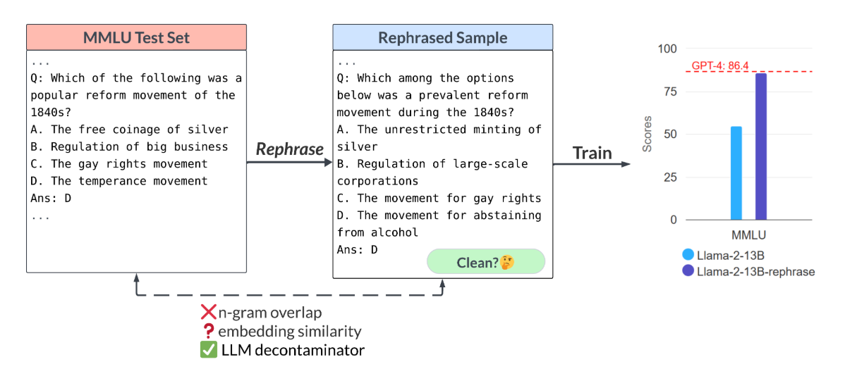 Below we demonstrate a rephrased sample from the MMLU benchmark. We show that if such samples are included in the training set, a 13B model can reach drastically high performance (MMLU 85.9). Unfortunately, existing detection methods (e.g., n-gram overlap, embedding similarity) fail to detect such contamination. The embedding similarity approach struggles to distinguish the rephrased question from other questions in the same subject (high school US history).
