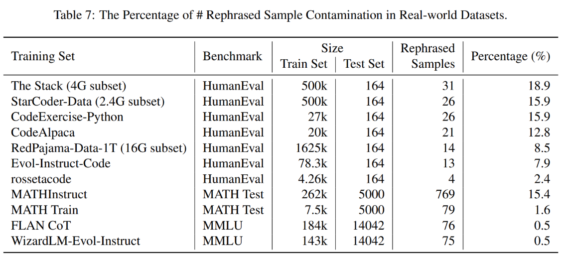 We apply the LLM decontaminator to widely used real-world datasets (e.g., the Stack, RedPajama, etc) and identify a substantial amount of rephrased samples. The table below displays the contamination percentage of different benchmarks in each training dataset.