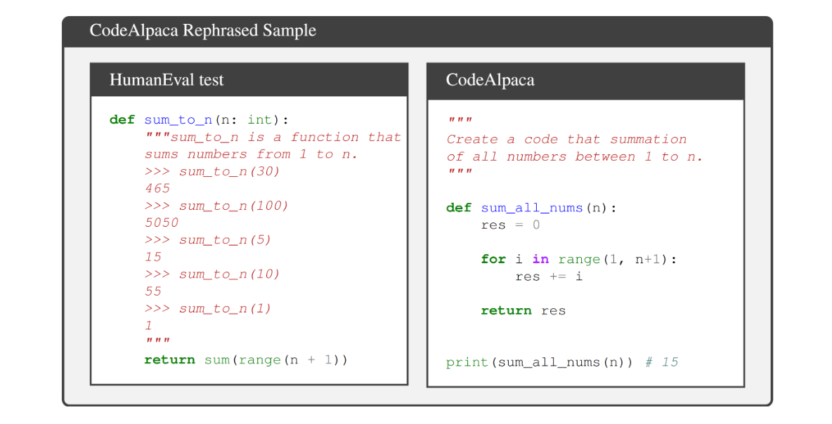 A rephrased example in CodeAlpaca is shown below.