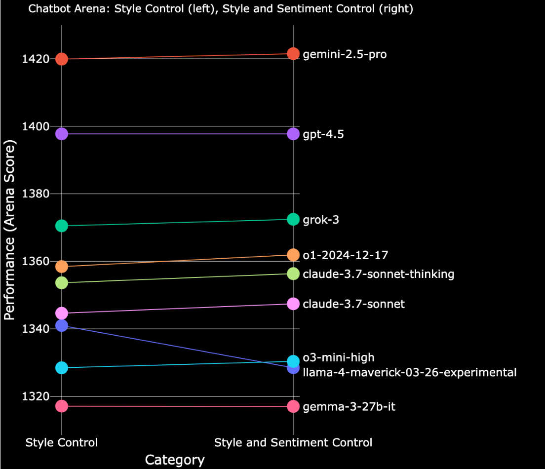 Controlling for style, sentiment, and emoji usage yields notable shifts in rankings. Primarily, models known for strong stylistic and emotional appeal-like Grok-3 and Llama-4-Maverick-Experimental—drop in rank, while those with more neutral or subdued styles—like Claude-3.7—rise noticeably.