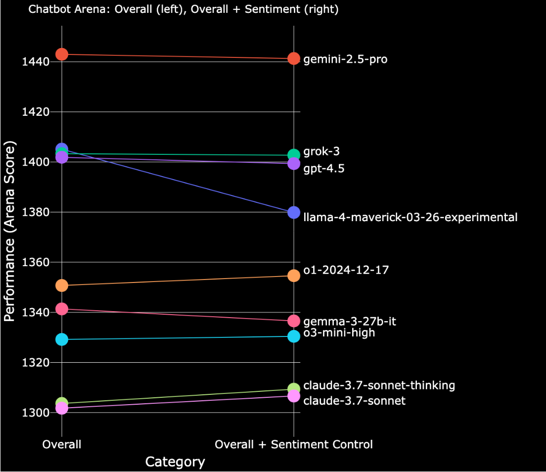You may have noticed that recent models on Chatbot Arena appear more emotionally expressive than their predecessors. But does this added sentiment actually improve their rankings on the leaderboard? Our previous exploration revealed that style — including formatting and length — plays a significant role in perceived model quality. Yet, we hypothesized that style may go beyond layout—perhaps sentiment and emojis are just as influential.