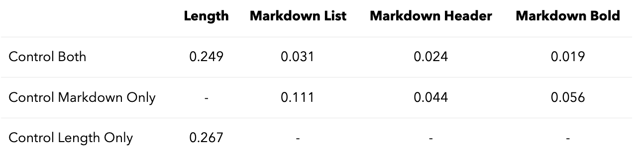 Background. To produce the results above, we controlled for the effect of style by adding extra “style features” into our Bradley-Terry regression. This is a standard technique in statistics, and has been recently used in LLM evaluations [1]. Additionally, there are studies suggesting potential bias for “pretty” and more detailed responses in humans [2, 3]. The idea is that, by including any confounding variables (e.g. response length) in the regression, we can attribute any increase in strength to the confounder, as opposed to the model. Then, the Bradley-Terry coefficient will be more reflective of the model’s intrinsic ability, as opposed to possible confounders. The definition of a confounder is to some extent up to our interpretation; as our style features, we use the (normalized) difference in response lengths, the number of markdown headers, and the number of lists.