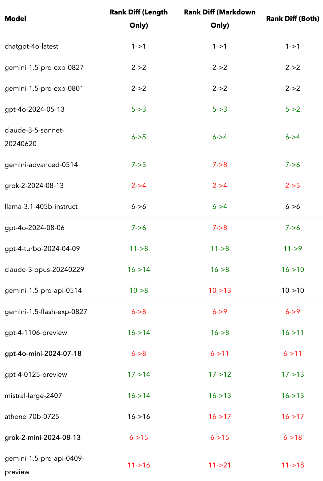Next, we compare the ranking changes between controlling for answer length only, markdown element only, and both. We present the Chatbot Arena Overall table first.