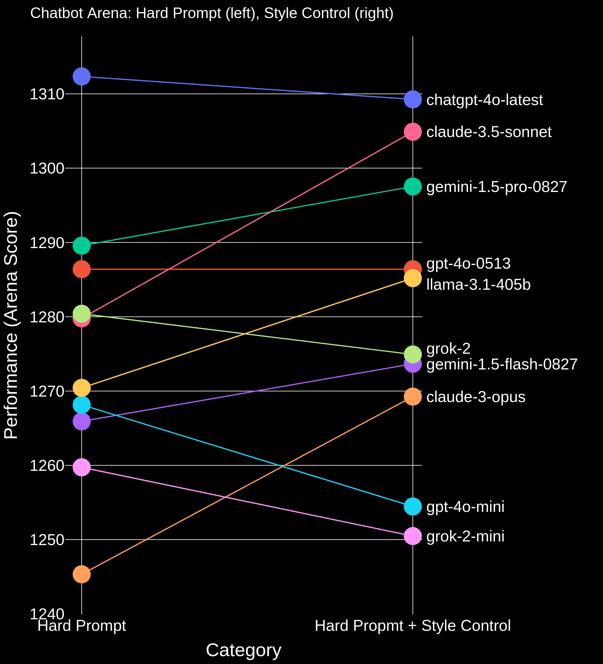 When controlling for length and style, we found noticeable shifts in the ranking. GPT-4o-mini and Grok-2-mini drop below most frontier models, and Claude 3.5 Sonnet, Opus, and Llama-3.1-405B rise substantially. In the Hard Prompt subset, Claude 3.5 Sonnet ties for #1 with chatgpt-4o-latest and Llama-3.1-405B climbs to #3. We are looking forward to seeing what the community does with this new tool for disaggregating style and substance!